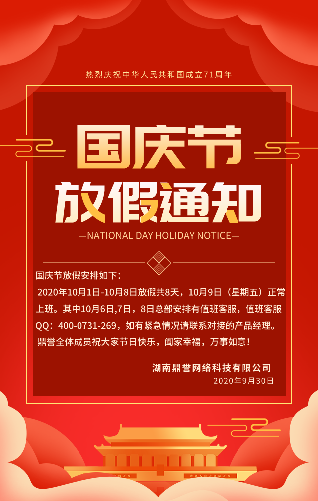 湖南鼎誉网络科技有限公司2020年国庆中秋放假通知!