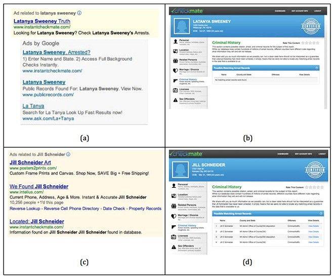A和C显示的是针对两个人各自姓名出现的广告,B和D表明该广告暗示存在犯罪前科所根据的是姓名类型,而非就是此人的档案