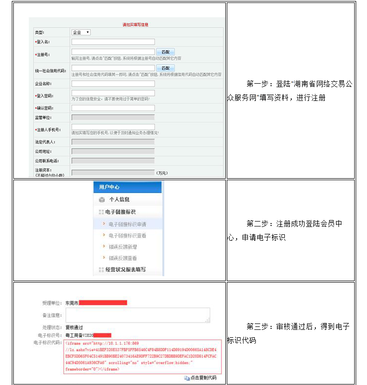 三、在湖南省网络交易公众服务网http://www.hngswj.gov.cn/websys/WebUser!input.action 上申请电子连接标识,待审核通过之后将电子链接标识代码布署到网站上面。